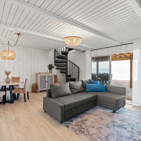 This exceptional beach property has two levels capturing stunning views from the lower and top deck spaces. The photo displays the first floor family room, dinette area, full bath and two bedrooms. The upstairs has an additional two bedrooms, large kitchen and walk out deck.